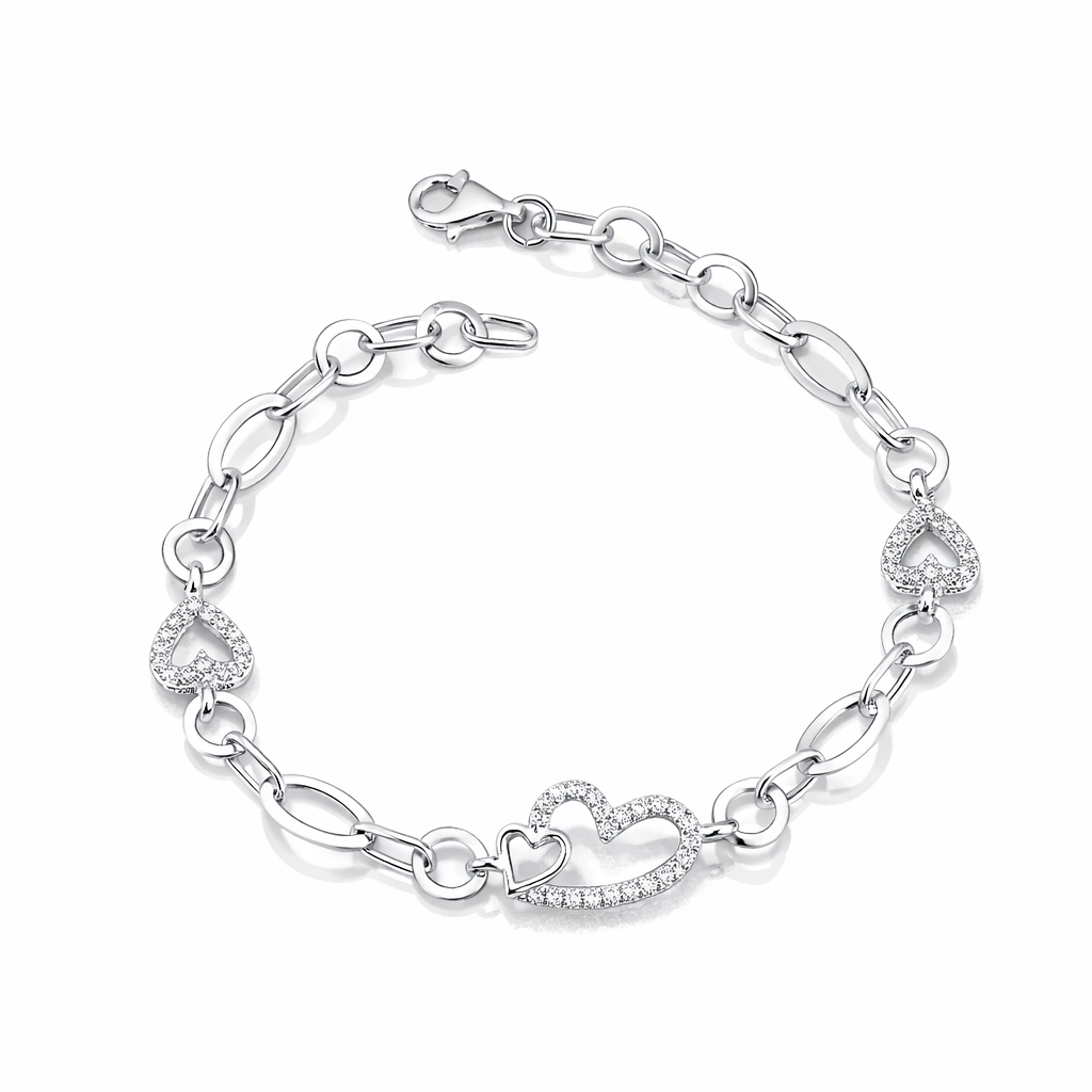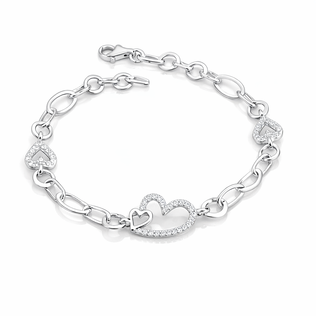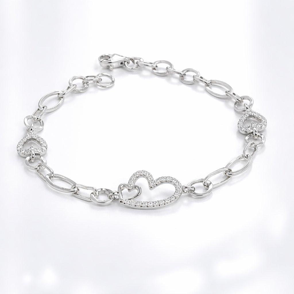 Realizată din argint veritabil 925, brățara impresionează prin lanțul său elegant cu zale ovale și inserții în formă de inimă, atent finisate. Elementul central, format din două inimi unite, este decorat cu pietre strălucitoare tip pavé, care captează lumina la fiecare mișcare, oferind un efect sofisticat și rafinat.
