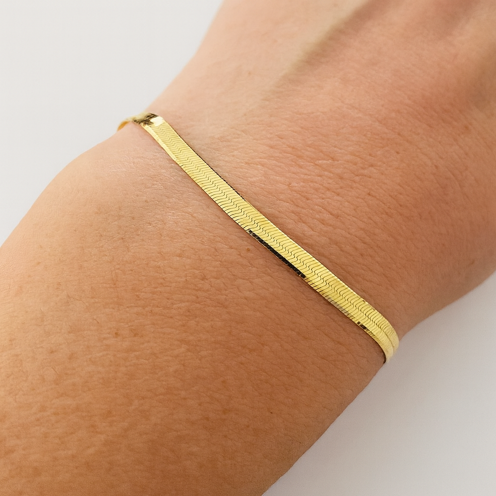 Adaugă o notă de eleganță oricărei ținute cu această brățară din argint 925 placată cu aur de 14K. Designul tip șarpe oferă o strălucire delicată și o textură flexibilă, ușor de purtat și de asortat.