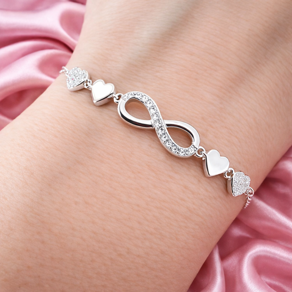 Această brățară din argint 925 rodiat este o bijuterie rafinată, creată pentru a simboliza iubirea infinită și legăturile autentice. Designul elegant îmbină armonios simbolul infinit, decorat cu pietre strălucitoare tip pavé, cu inimi atent finisate, rezultând o piesă feminină, delicată și extrem de versatilă.