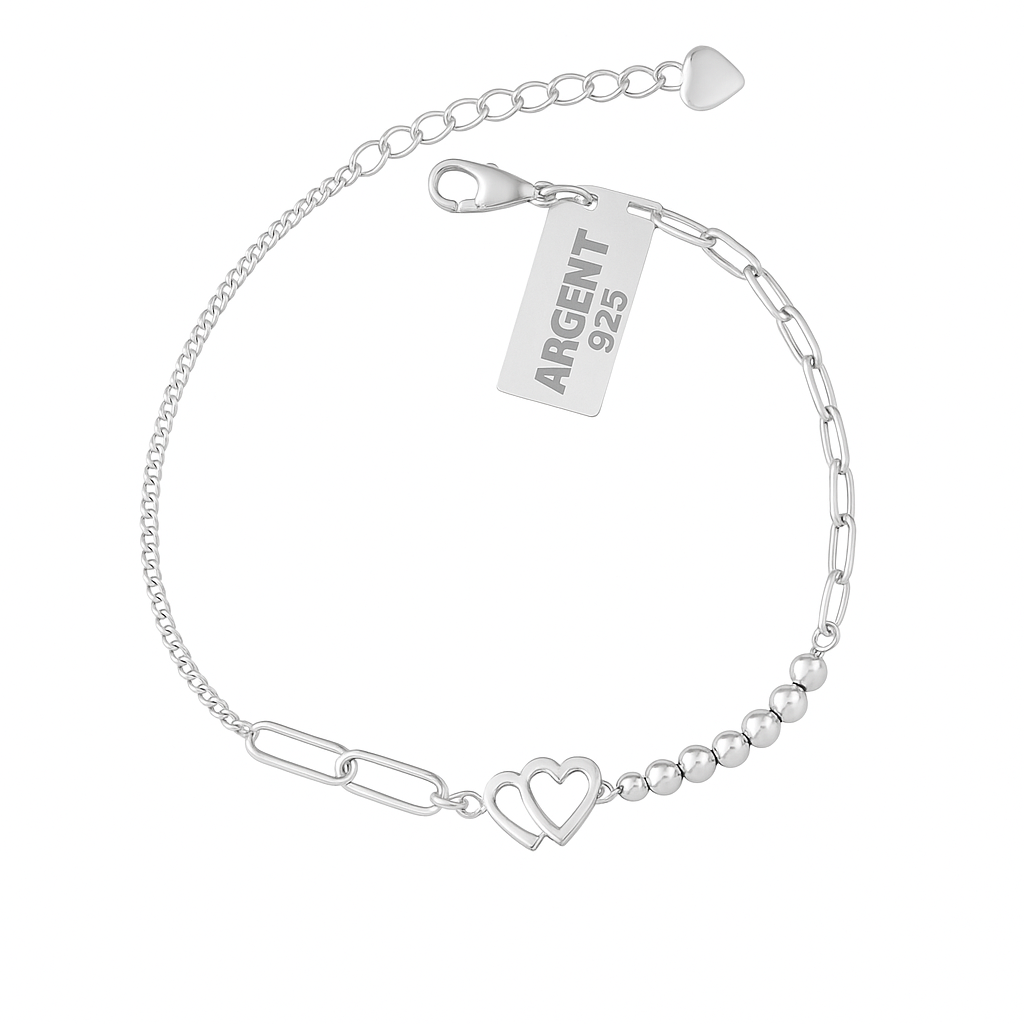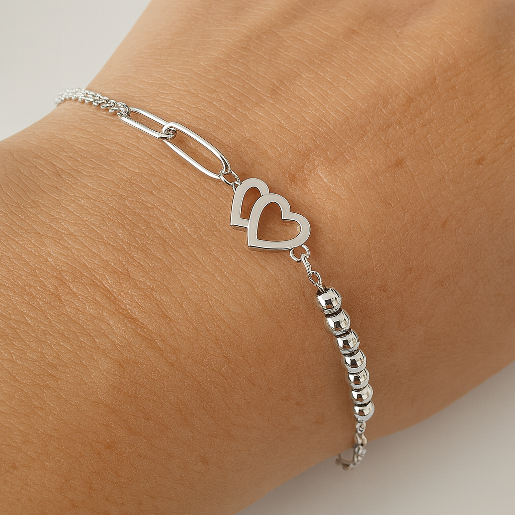 Brățară elegantă din argint 925 rodiat, cu două inimi împletite și aspect de aur alb. Lungime reglabilă 16+4 cm, greutate aprox. 3.25 g. Marcaj ANPC, livrată în cutie de bijuterii cadou, cu factură și certificat de conformitate. Parte din colecția Infinity Bijoux, simbol al iubirii și eleganței.
