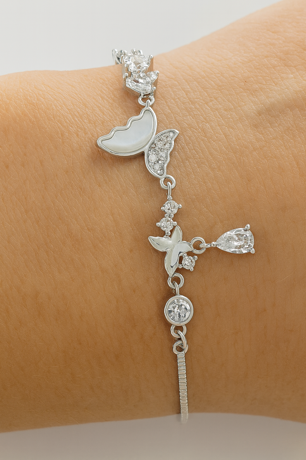 Descoperă eleganța rafinată cu brățara „Wings of Shine” din argint 925 rodiat, creată pentru femeile care iubesc delicatețea și strălucirea subtilă. Designul unic cu fluturi grațioși și zirconii cubic strălucitori simbolizează libertatea, frumusețea și feminitatea, transformând fiecare apariție într-un moment special.