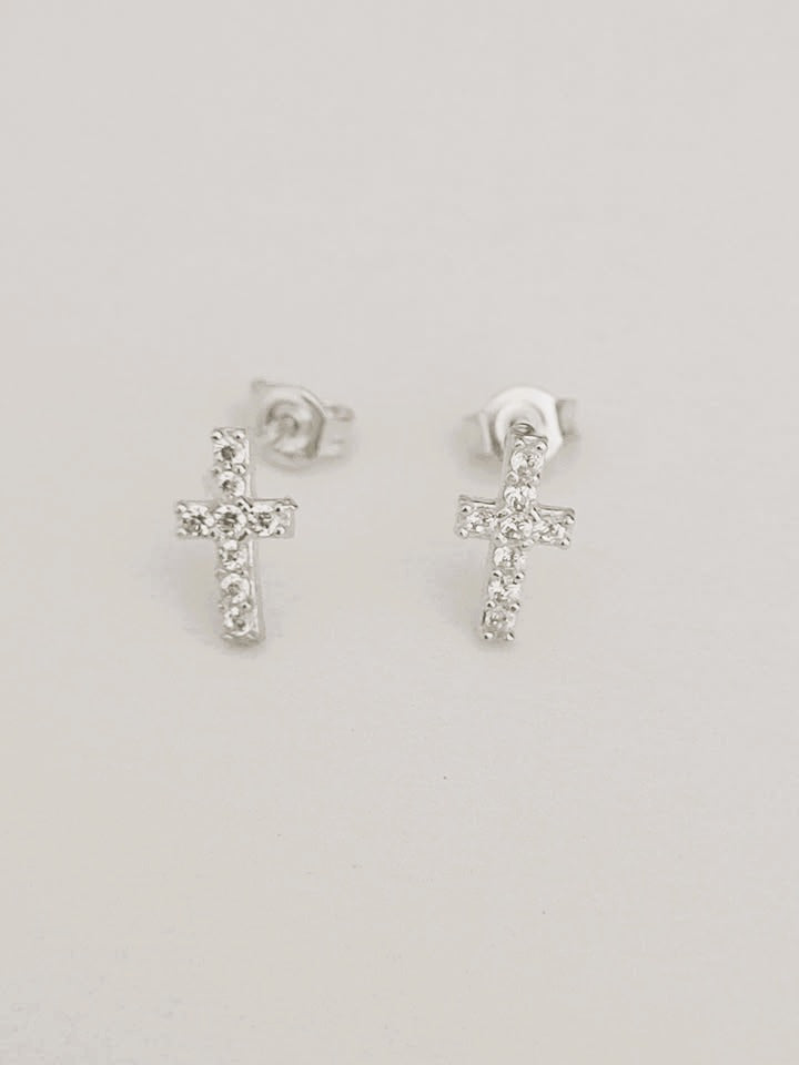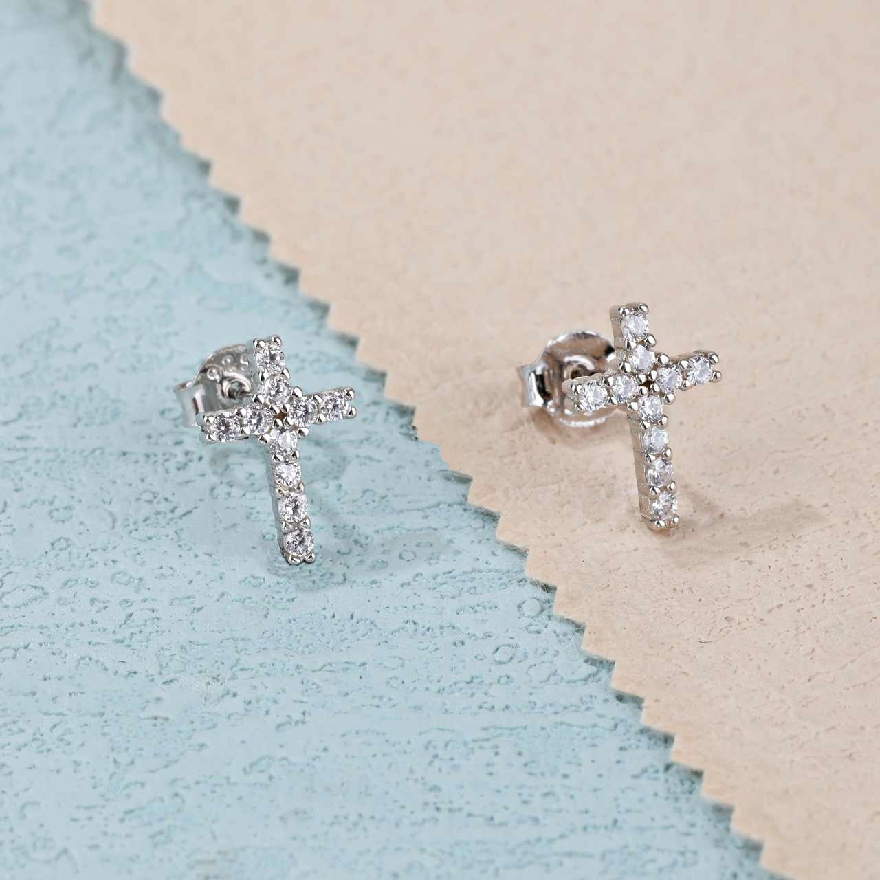 Cercei cu surub din argint 925 model cruciulita cu cristale din zirconii