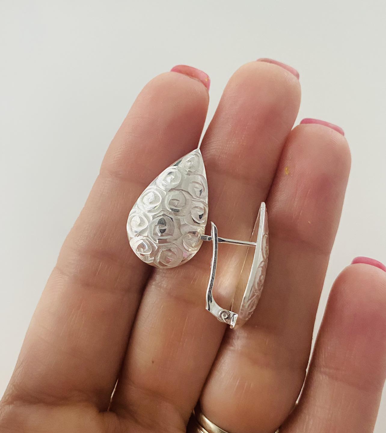 Cercei din Argint 925 Lacrima Florală, Model Gravură Spiralată
