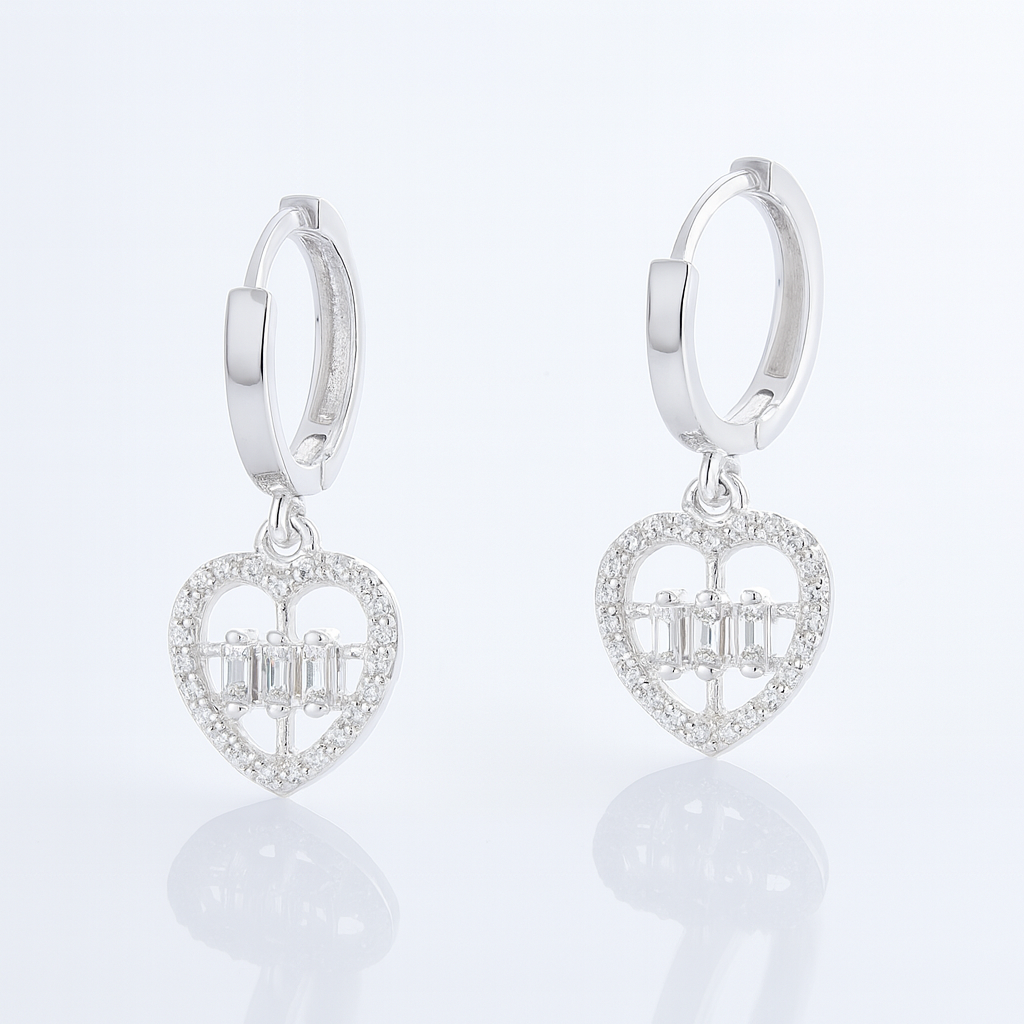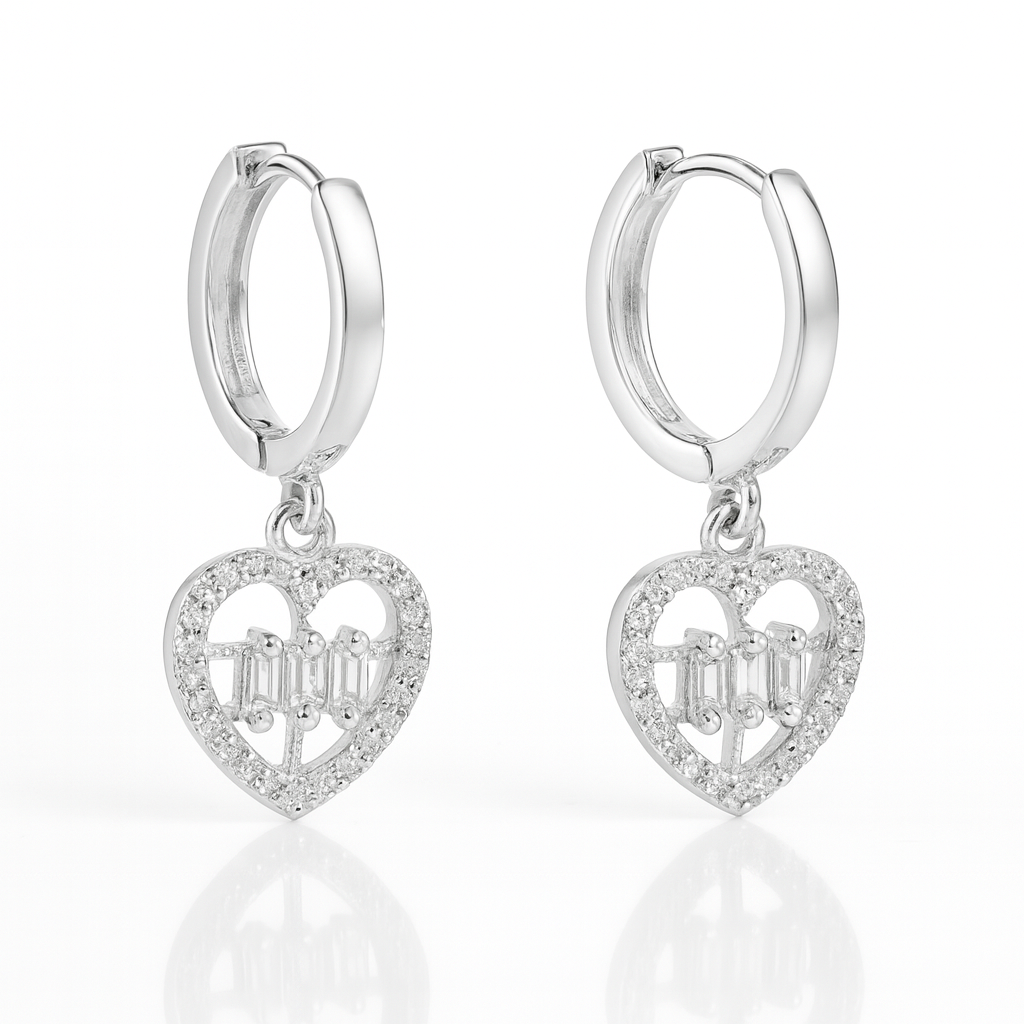 Cercei Inimă din Argint 925 cu Pietre Baguette, Bijuterie Elegantă