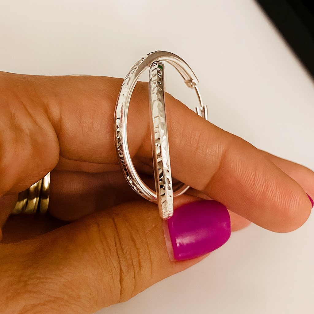 Descoperă eleganța atemporală cu acești cercei rotunzi din argint 925 de înaltă calitate, cu o textură ciocănită fină ce reflectă lumina într-un mod spectaculos. Cu un diametru de 3.5 cm și o greutate de 3.7 grame, sunt perfecți pentru purtare zilnică sau ocazii speciale.
