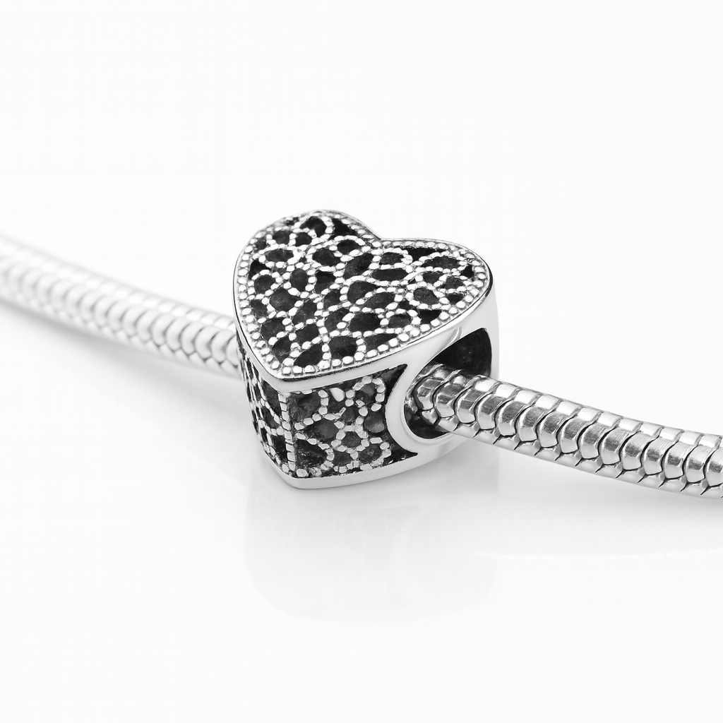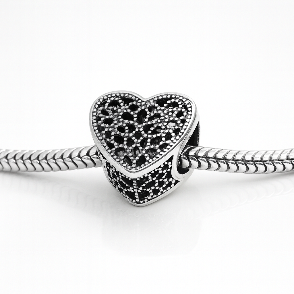 Acest charm în formă de inimă din Argint 925, lucrat cu un model filigranat complex, este o bijuterie care îmbină eleganța tradițională cu rafinamentul modern. Textura sa detaliată, realizată cu grijă, creează un efect vizual de profunzime ce pune în valoare contrastul dintre argintul oxidat și suprafețele perfect lustruite. Cu o greutate de aproximativ 1,55 grame, charmul este suficient de solid pentru a rezista în timp, dar în același timp delicat pentru a se integra armonios în orice brățară compatibilă.