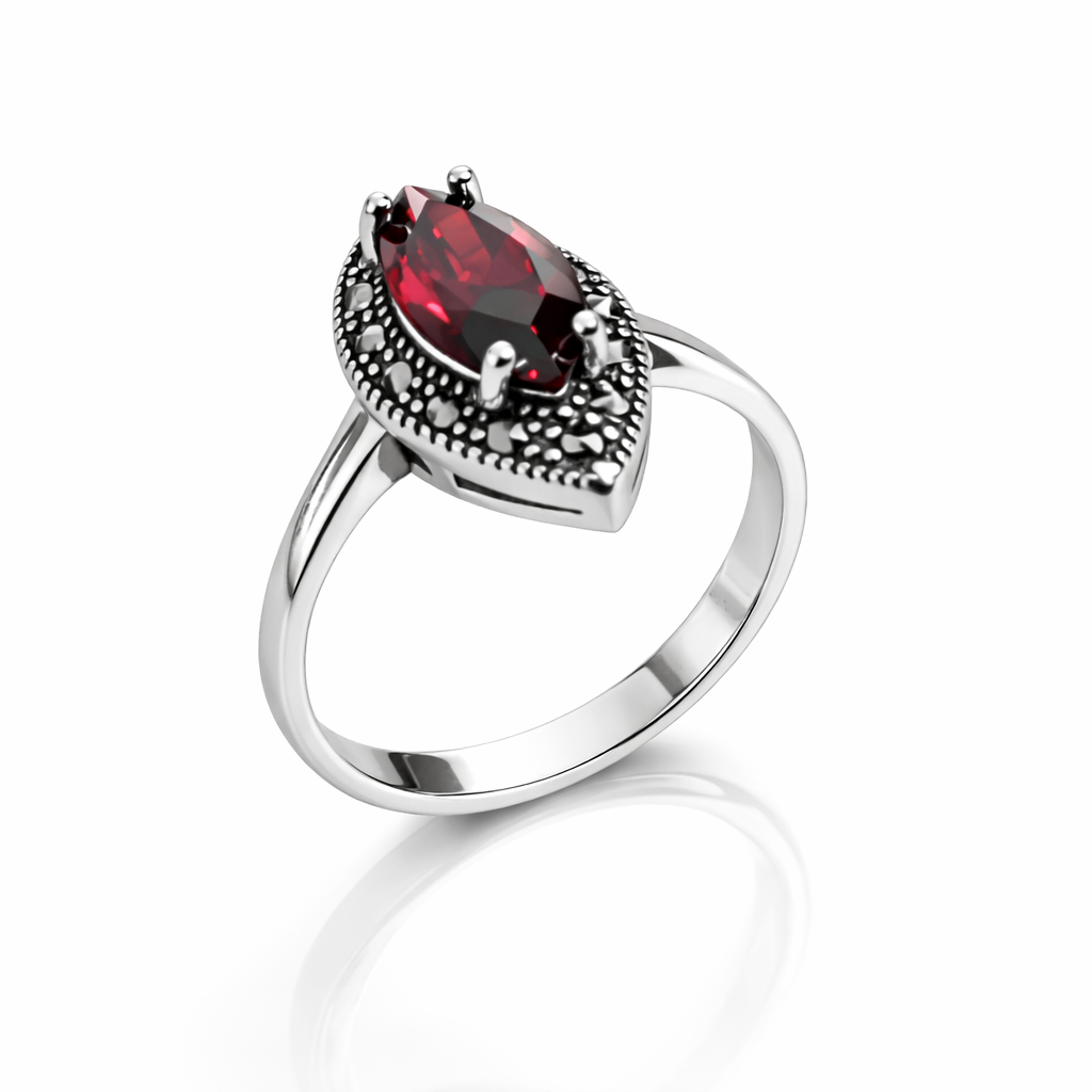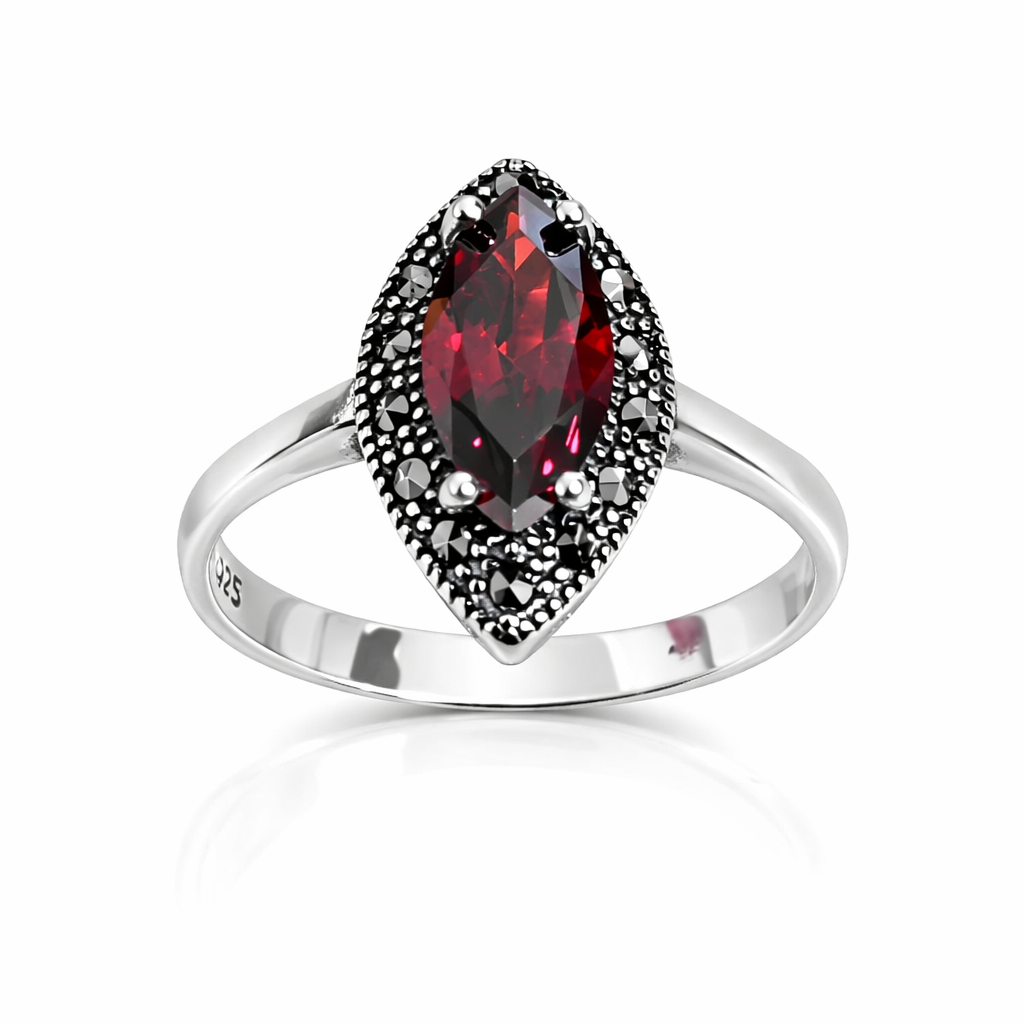 Inel Argint 925 „Imperial Garnet Noir” cu Marcazite – Design Elegant, Piatră Centrală 12x6 mm. ID504