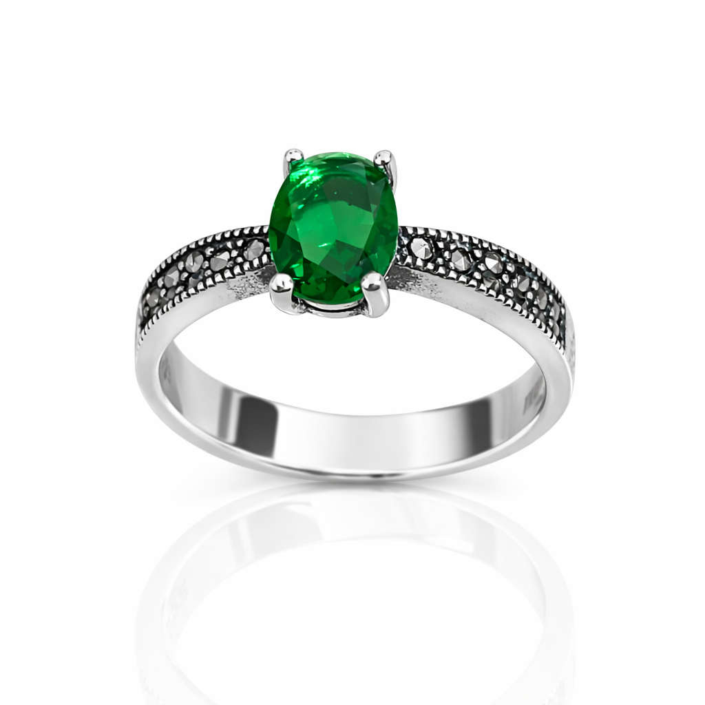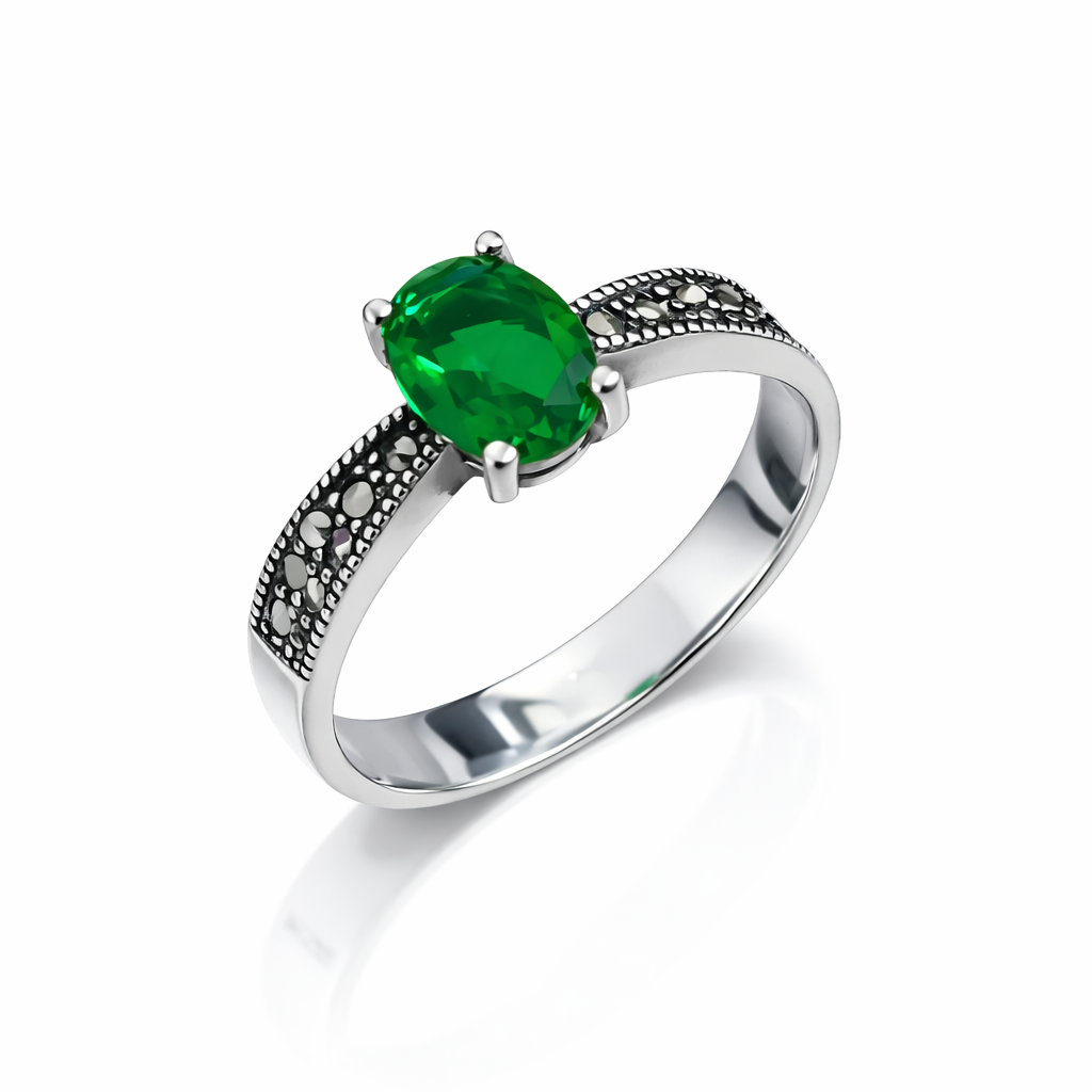 Inel Argint 925 „Smarald Nocturn” cu Marcasite și Piatră Verde Ovală