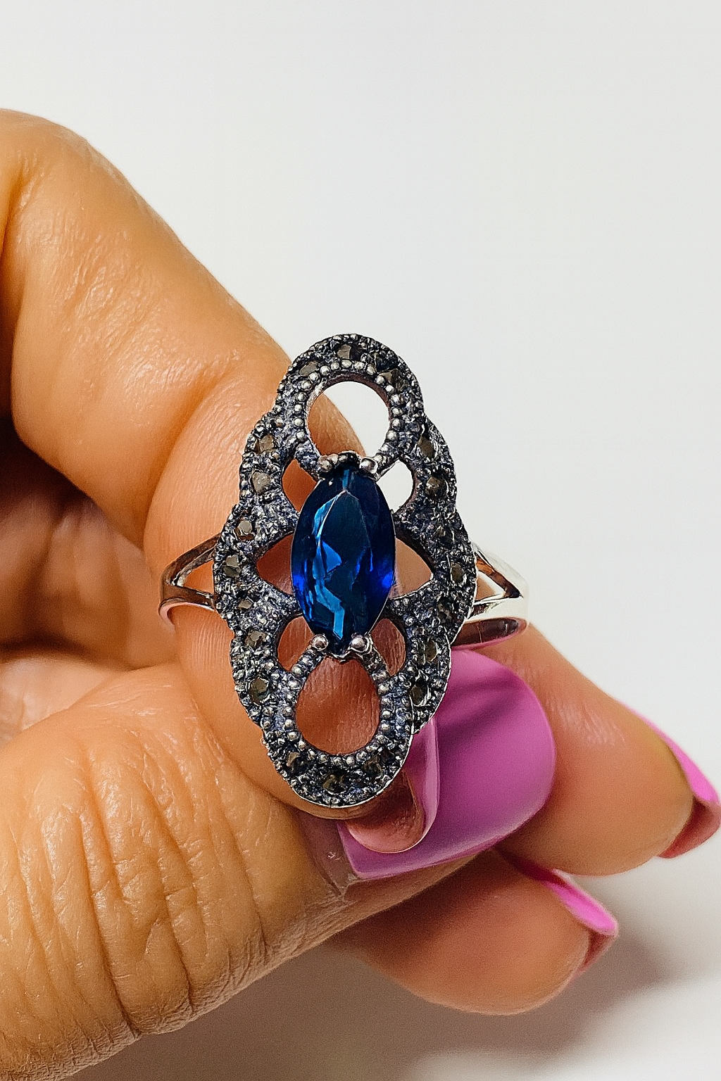 Inel de Argint 925 cu Piatra Albastră Marquise și Detalii Vintage mărimea 22