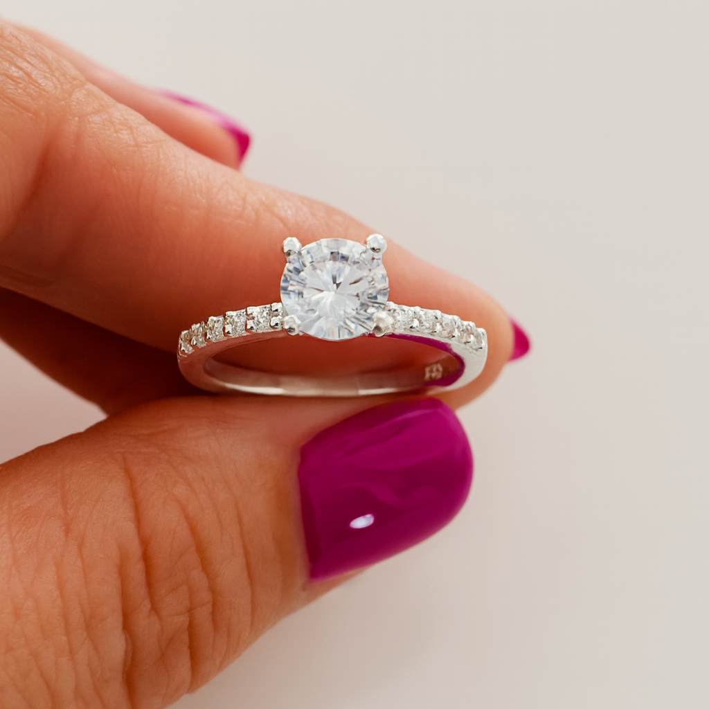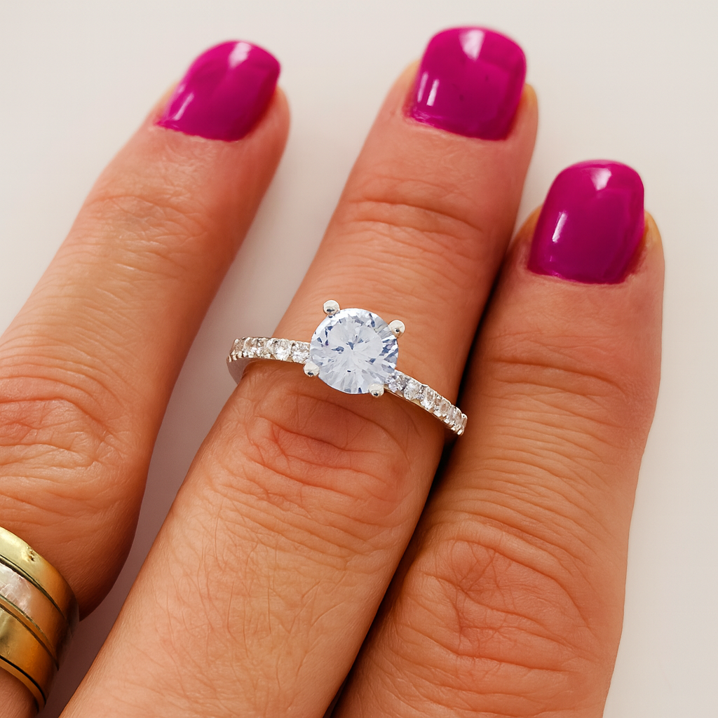 Descoperă rafinamentul pur al acestui inel de logodnă din argint 925, cu o greutate de aproximativ 2.45 grame, creat pentru a simboliza dragostea adevărată și legătura eternă dintre doi oameni. Realizat cu grijă și finisat impecabil, inelul îmbină simplitatea argintului cu strălucirea intensă a pietrei centrale, oferind un aspect sofisticat și atemporal. Fiecare piesă este verificată și marcată de ANPC, garantând autenticitatea materialului. Produsul este livrat într-o cutie de bijuterii elegantă, împreună cu factură și certificat de conformitate, făcându-l cadoul ideal pentru o cerere în căsătorie memorabilă.