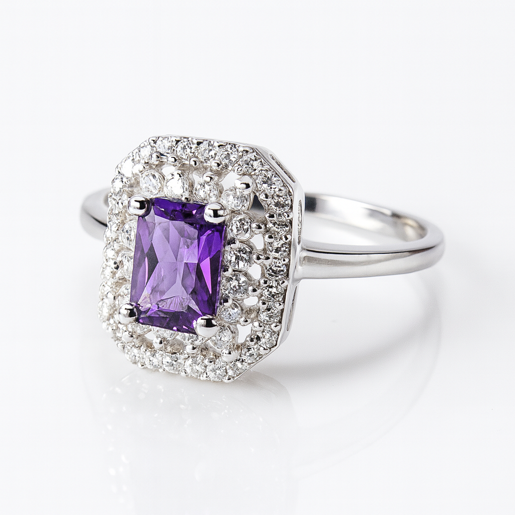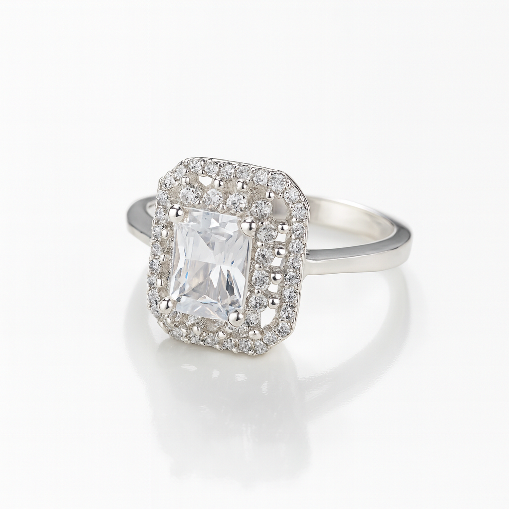 Inel de logodnă din argint 925 cu zircon dreptunghiular și dublu halou de cristale – simbolul iubirii eterne