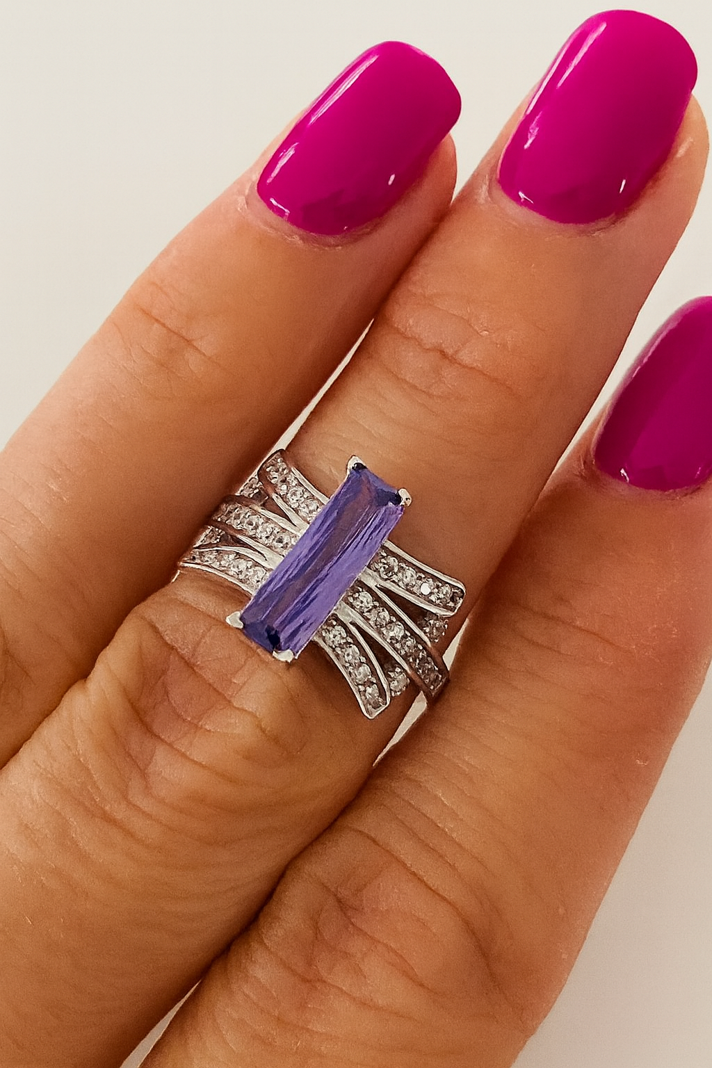 Descoperă farmecul unic al inelului "Eternal Shine", o piesă excentrică și cu adevărat memorabilă din colecția Infinity Bijoux. Realizat din argint 925 rodiat, cu un finisaj rafinat ce imită perfect strălucirea aurului alb, acest inel aduce în prim-plan o piatră centrală mov deschis cu tăietură rectangulară, menită să atragă privirile și să ofere un impact vizual de excepție.