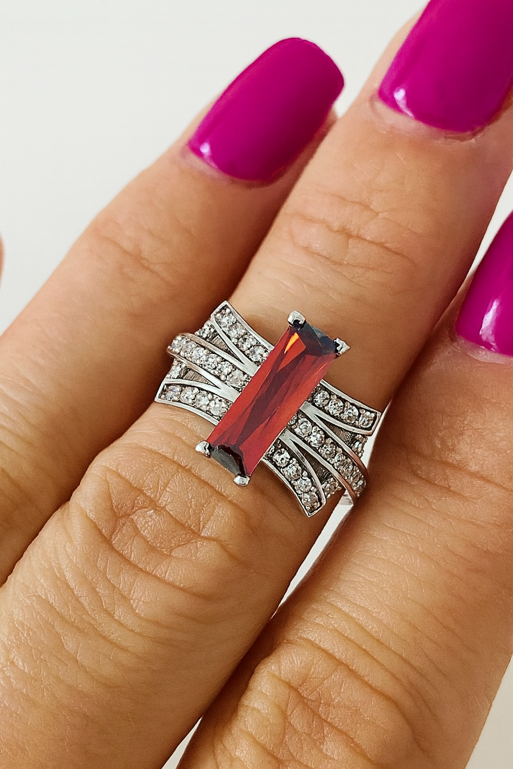 Atrage toate privirile cu inelul "Crimson Eternity", o piesă unică din argint 925 rodiat, cu aspect luxos de aur alb. Piatra centrală, un cristal roșu rectangular intens, este pusă în valoare de designul excentric cu linii fluide și strălucirea subtilă a pietrelor albe ce imită diamantele.