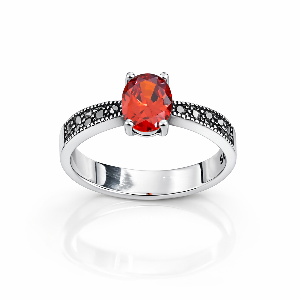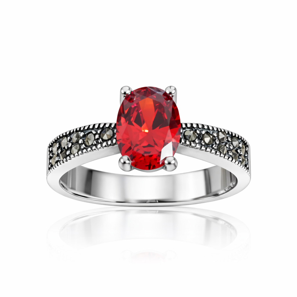 Inel Imperial Ruby Night – Argint 925 cu Marcasite și Piatră Roșie Ovală. ID514