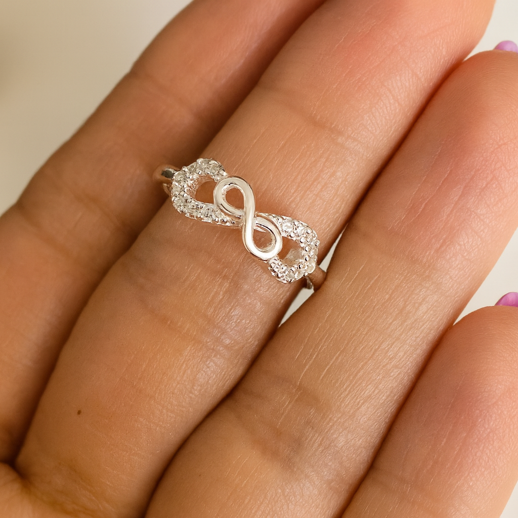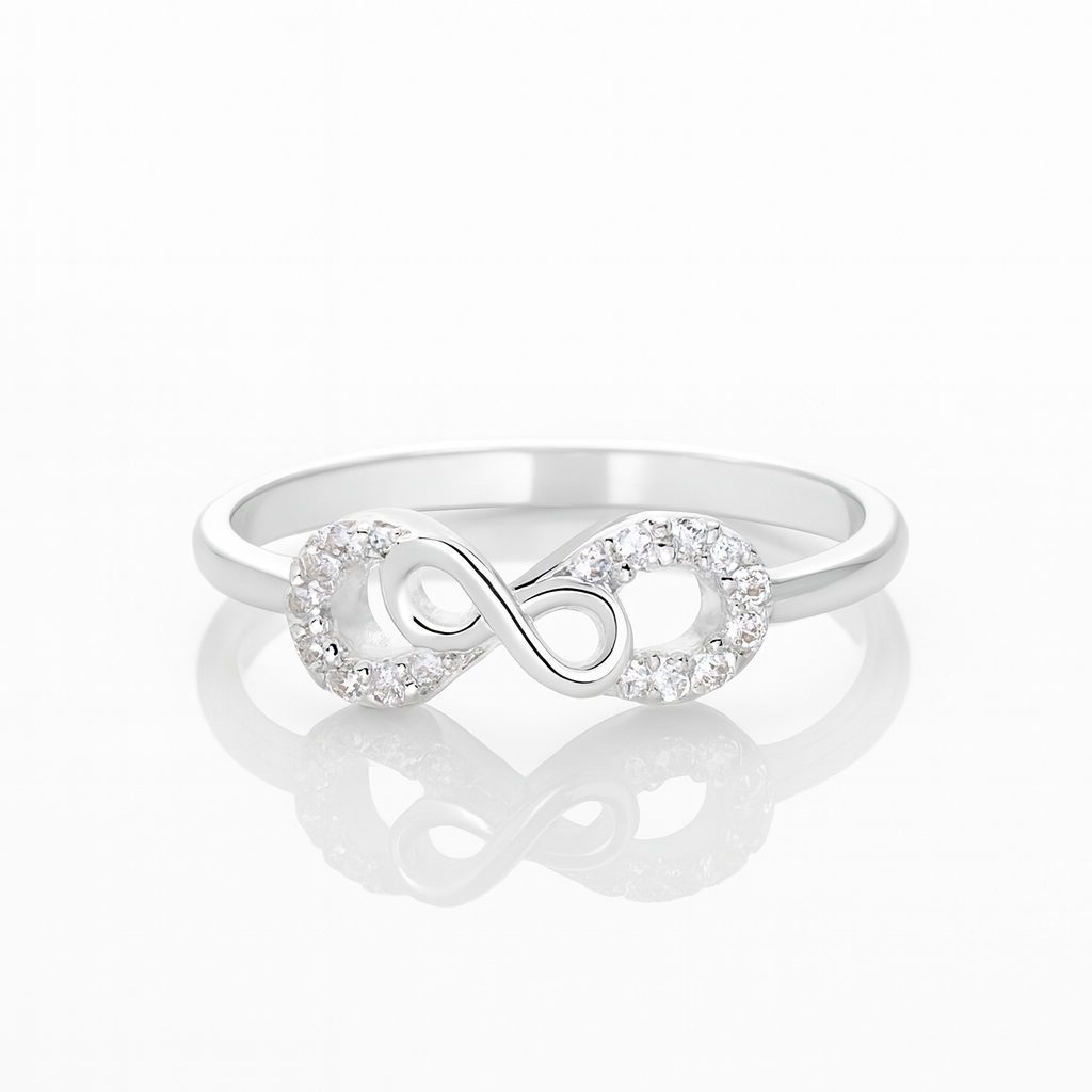 Simbolul infinitului (∞) reprezintă iubirea eternă, loialitatea și conexiunea fără sfârșit. Este un semn al echilibrului, armoniei și al legăturilor care depășesc timpul. Purtarea unui astfel de inel exprimă promisiunea unei relații durabile, a unei prietenii adevărate sau a unei iubiri ce transcende limitele.