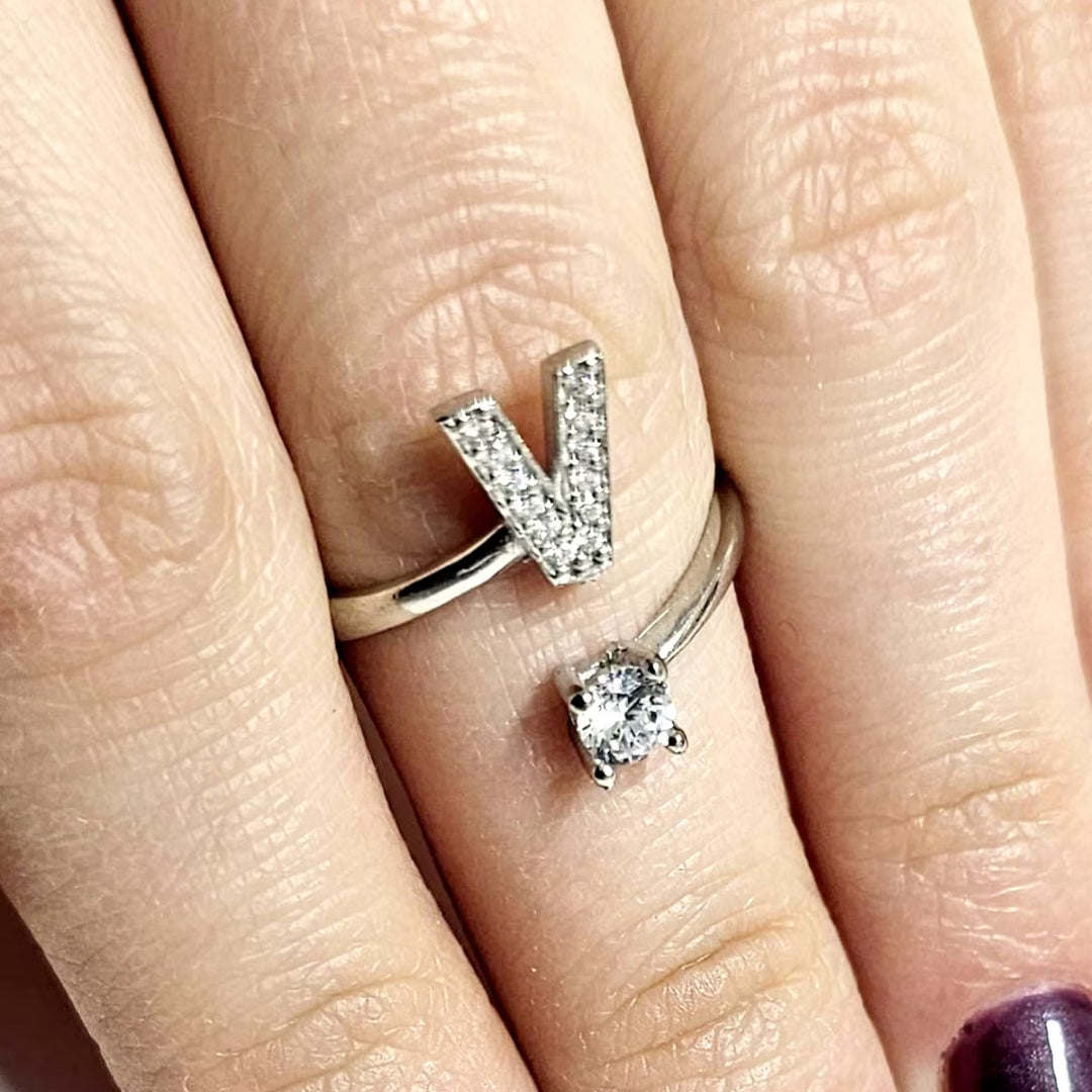 Inelul reglabil din argint 925 cu initiala V face parte din eleganta colectie Infinity Bijoux. Stralucirea oferita de pietrele de zirconiu atent finisate si detaliile impecabile fac ca inelul sa fie potrivit oricarei ocazii. Material: Argint 925. Dimensiune element: 1.1 cm Diametru: 1.7 cm (dimensiune reglabila). De asemenea, veti primi inclus si cutiuta de cadou in care produsul dumneavoastra va fi ambalat cu multa grija.