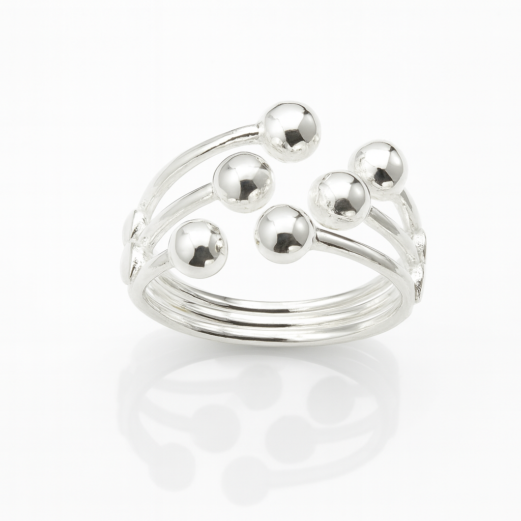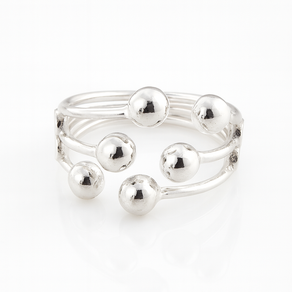 Răsfață-te cu farmecul modern al acestui inel reglabil din argint 925 cu biluțe, o bijuterie contemporană ce emană finețe și echilibru. Realizat din argint autentic de calitate superioară, inelul are o greutate de aproximativ 4.3 grame și un design deosebit, format din linii delicate și șase biluțe lucioase ce reflectă lumina într-un mod subtil și rafinat.