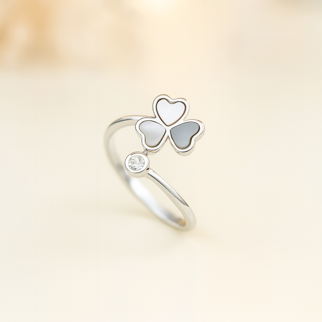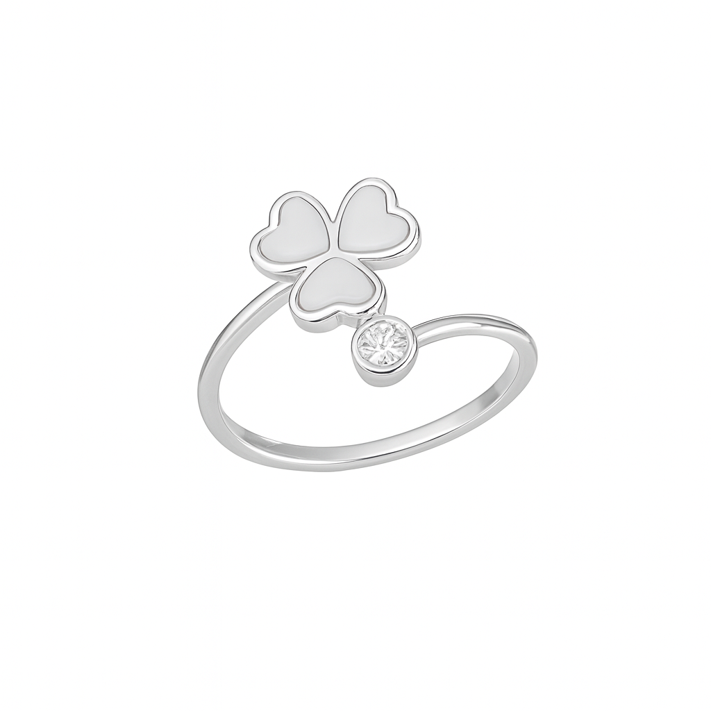 Inel Reglabil Trifoi cu Email Alb din Argint 925 Rodiat, Design Elegant