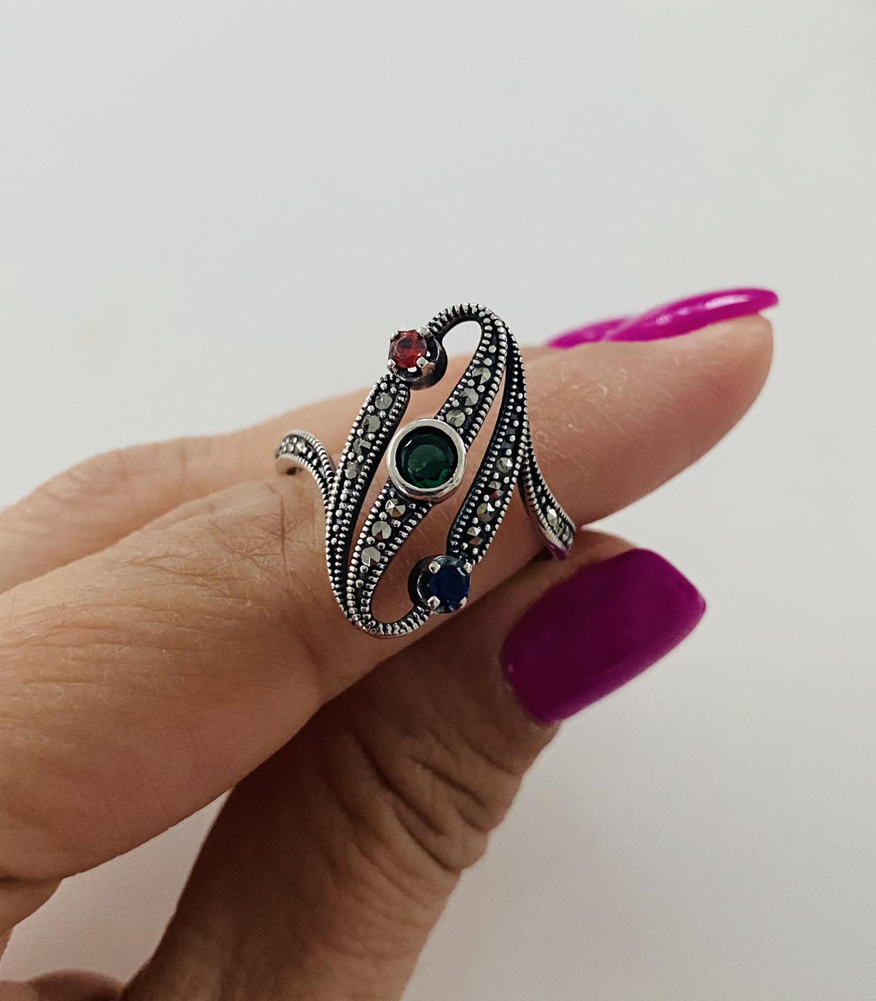 Inel „Trilogia Culorilor” din argint 925 cu marcasite și pietre colorate roșu, verde și albastru. Bijuterie elegantă, ideală pentru cadou sau colecția ta personală.