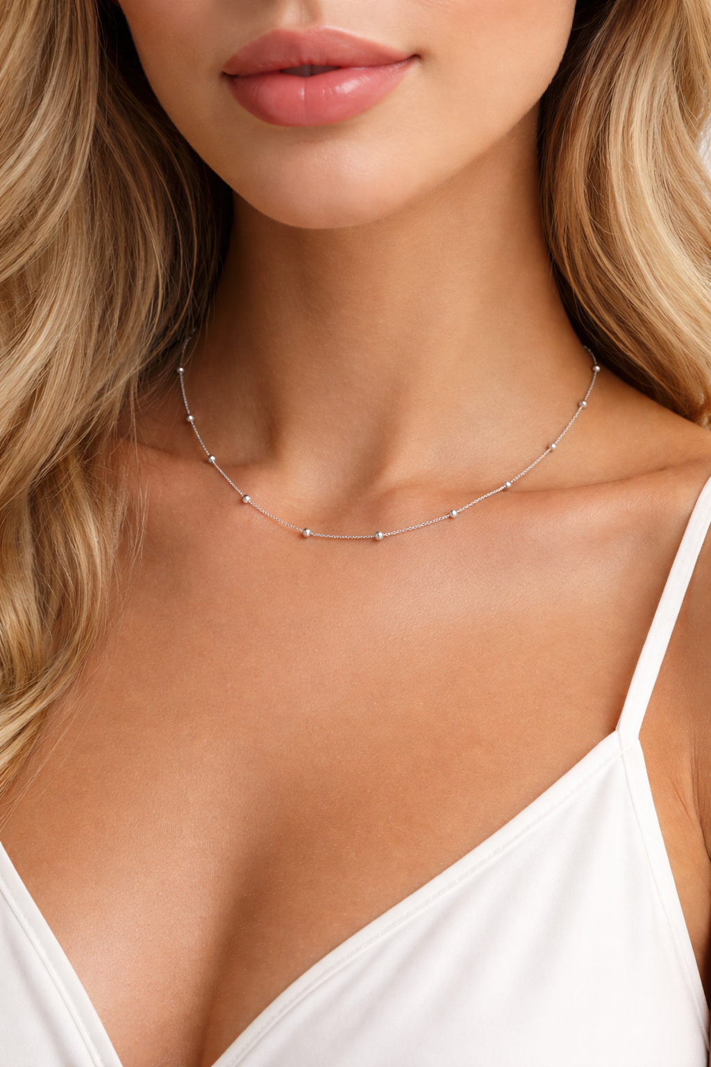 Cu o lungime de 45 cm, lanțul se așază perfect pe gât, fiind ideal atât pentru purtare zilnică, cât și pentru ocazii speciale. Grosimea de 1 mm asigură un echilibru optim între finețe și durabilitate, iar biluțele cu diametrul de 2.5 mm, dispuse uniform de-a lungul lanțului, adaugă un accent subtil, modern și feminin.